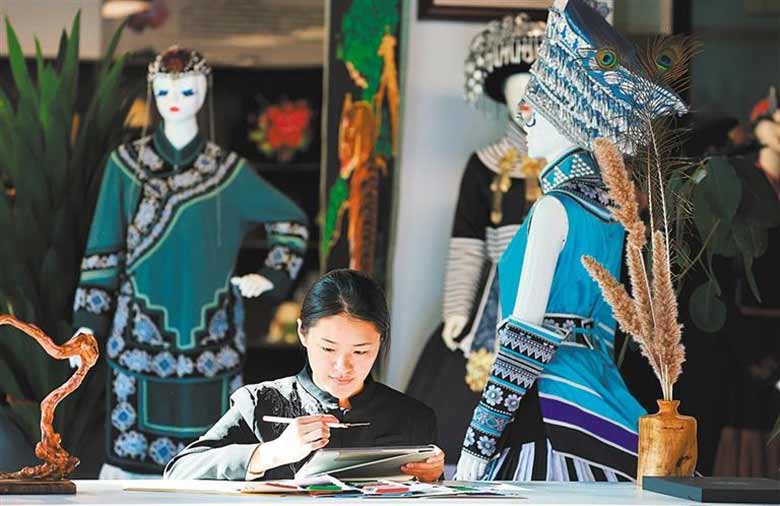 12月4日,楚雄州南华县“00后”彝族服饰制作传承人陈海燕在设计纹样。陈海燕通过创新设计与现代文创理念融合,为传统技艺注入鲜活元素。