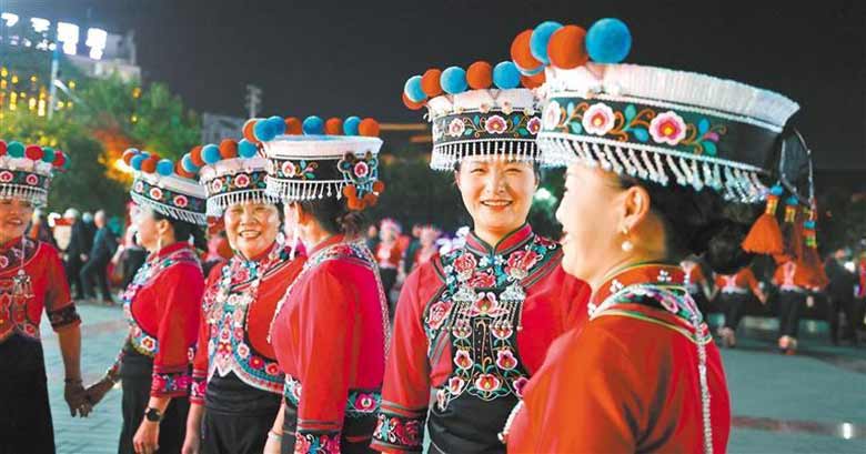 12月3日,楚雄州牟定县,市民穿着彝绣服饰参加左脚舞活动。彝绣图案丰富,色彩鲜艳,寄托了彝族人对生活的美好向往。