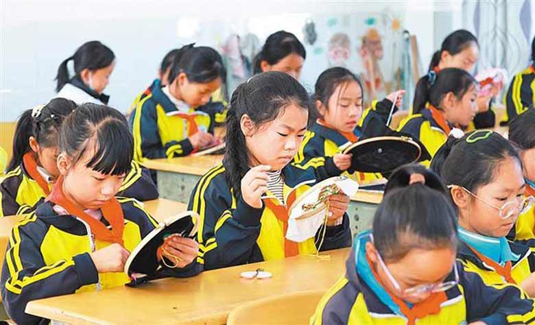 12月4日,楚雄州南华县北城小学学生在制作彝绣作品。2020年,北城小学将彝绣课堂纳入课后兴趣服务课堂,让学生在实践中感受和传承彝绣文化。