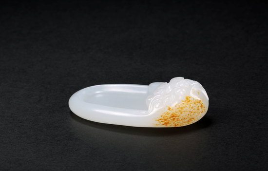 香插形似一渊湖水,水面平静而无波澜,润白的玉质更添无尽的恬静,一侧浮雕水中绞龙,头部浮出于水面,震护一池平安。作品中动静之间的激烈碰撞,又十分的统一而和谐。