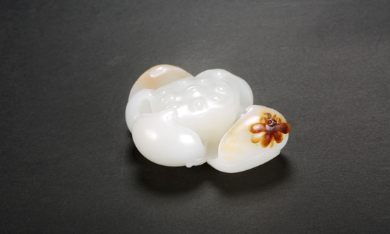 作品依形而刻,取边缘黄皮色为荷叶边缘,正应自然之本色纹理;另以白玉之白润展现荷叶厚重多汁,偶有虫吃之孔,更显生动;荷花含苞待放侧立一旁,似为枯黄、虫伤之荷增添无限希望。一束荷花亭亭立,独盘荷叶水上栖。作品统一中彰显戏剧式冲突,赏玩中兼具实用之趣。