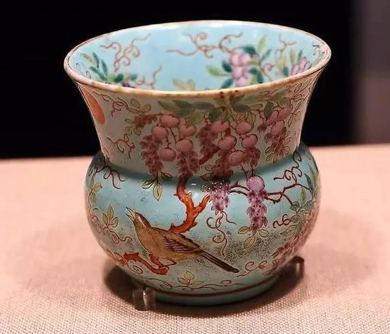 乾隆粉彩是乾隆朝瓷器中所占此重较大的品种之一,在雍正瓷的基础上又有新的突破。乾隆朝除了白地绘粉彩外,还有色地粉 彩或色地开光中绘粉彩等品种。另外,乾隆朝还有部分在粉彩瓷器的内壁及底足内施绿彩,俗称“绿里绿底”,一直流行到清末、民国。乾隆朝的“绿里绿底”极浅 淡,迎光侧看釉面有极细小的皱纹,像微风吹过平静的湖面而形成的细波。