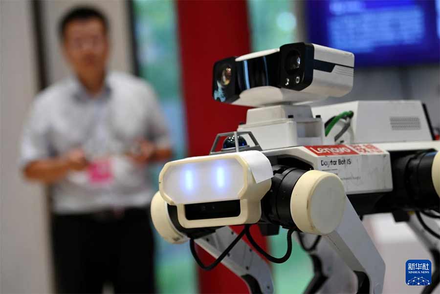 9月17日,工作人员在论坛的文化遗产数字化精品项目展上操作展示应用于应县木塔数字化保护项目的联想晨星六足机器狗。新华社记者 李一博 摄