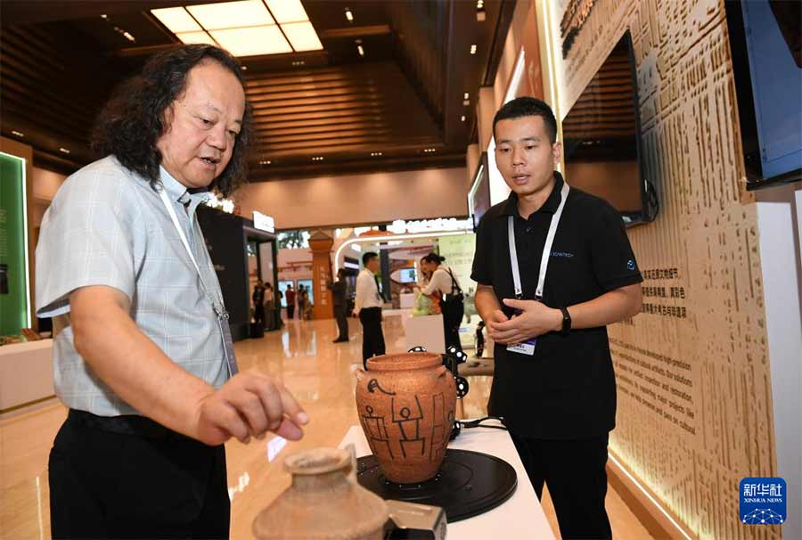 9月17日,与会嘉宾在论坛的文化遗产数字化精品项目展上参观宝鸡青铜器博物院《宅兹中国数字化展》。新华社记者 李一博 摄