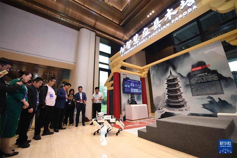 9月17日,与会嘉宾在论坛的文化遗产数字化精品项目展上了解AI智慧应县木塔数字化保护项目。新华社记者 李一博 摄