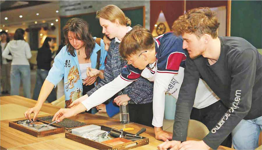 2025“国际中文日”活动上,留学生在体验活字印刷。(通讯员 孔勇 报道)