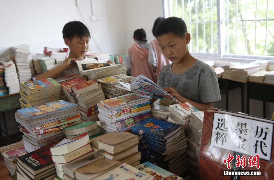 乐阳小学有268名小学和学前班学生,陈秋菊所带的五年级37个学生,近2/3是留守儿童,多数又是独生子女,由单亲监护和隔代监护。图为陈秋菊的学生在图书室翻书。陈秋菊说,班上的孩子没有成绩特别突出的,也没有成绩特别差的。她说自己更注意爱的教育:“我希望自己带的这些学生,成为懂得感恩、懂得付出、学会爱的学生。”中新社记者 张浩 摄