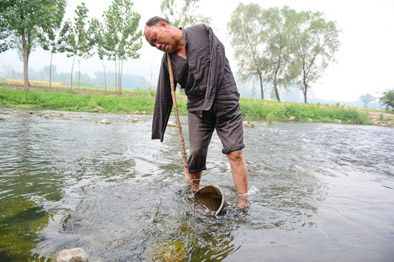 ▲图为贾文其头夹木棍用水桶在树林边的小河里打水。