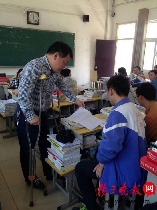 2016年暑期高招工作仍然在进行中,江苏省涟水中学高三(24)班的46名学生中有42人达本科线,其中不少同学也已经陆续被各大高校录取,就在大家为取得这一优异成绩高兴的时候,他们深知这一切都离不开一个人,他就是高三年级部主任、高三(24)班班主任、数学教师徐敏胄,一位在高考前夕崴了脚还拄着拐棍为学生们上课的老师。