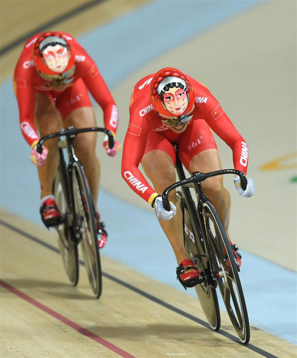 8月12日,中国选手宫金杰(前)和钟天使在比赛中当日,在2016年里约奥运会场地自行车女子团体竞速赛第一轮比赛中,中国队以56秒376的成绩打破世界纪录。 新华社记者李尕摄