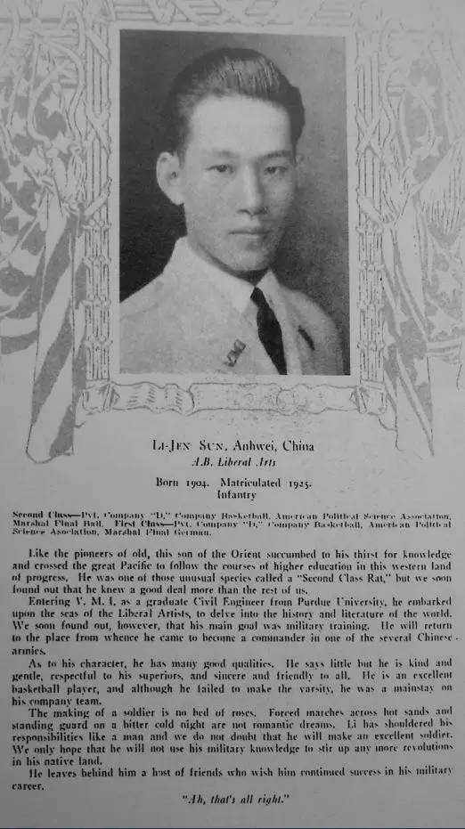 1923年,孙立人赴美留学,先在普渡大学继续攻读土木工程。但从军报国的心却一刻也没有停息,不久后,他就主动申请转入弗吉尼亚军校,学习军事。弗吉尼亚军校是美国著名的军校,马歇尔、巴顿、麦迪威等名将即毕业于该校。