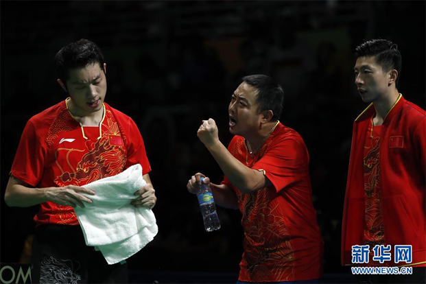 8月17日,中国队教练刘国梁(中)为队员许昕(左)加油。