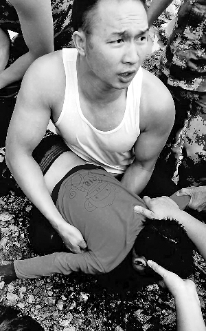 小孩被救出后,赵云松将其头朝下趴在腿上控水。