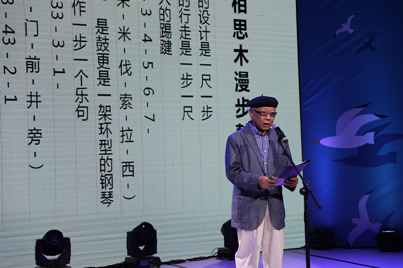 曾被诗歌评论家誉为“台湾最善于表现离人乡愁题材的诗人之一”的诗人郑愁予,是当夜第一位朗诵的诗人。在主持人陈晓楠和歌手钟立风的引领下,这位阔别大家视野已久的老诗人走上了“诗与歌的和鸣跨界音乐会”的舞台。还是带着那顶郑愁予范儿的黑色呢帽,穿着蓝衫。他为读者首先朗读了三首自己创作的诗歌——《与相思木漫步鼓浪屿》《大胆岛童谣》《烟火是战火的女儿》,并兴致盎然地清唱了一首自己的诗作《偈》。