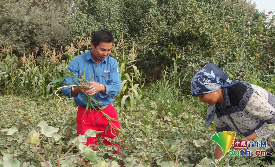 “金胡杨”志愿者李慧军(左)帮村民摘棉花地里的杂草。