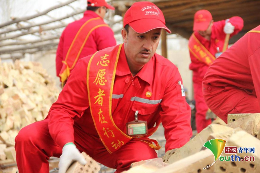 “金胡杨”志愿者吐尔洪·阿布都热依木帮村民吾布里哈斯重建家园。