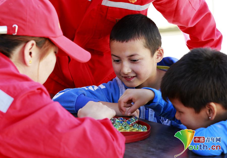 “金胡杨”志愿者陪福利院的孩子下跳棋。