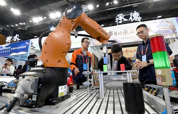 在河北邯郸举行的河北省第二届职业技能大赛上,参观者在展演区参观。新华社发