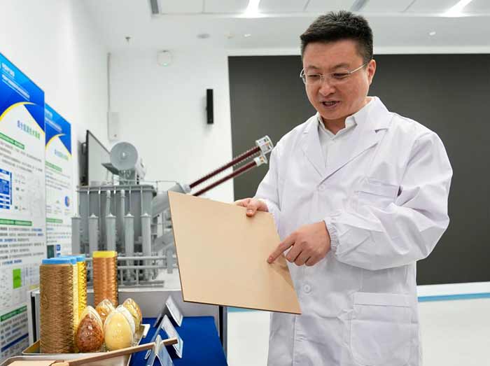 1月27日,张帆在介绍特高压变压器的关键材料绝缘纸板。新华社记者 刘颖 摄