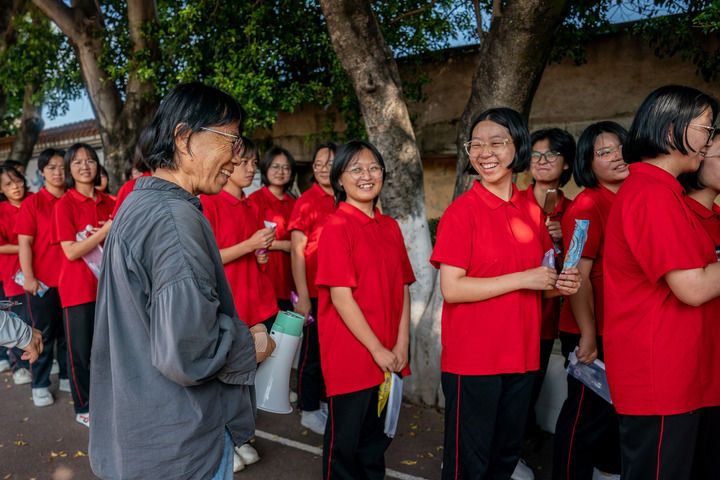 2024年6月7日,张桂梅在考场外组织走出考场的学生集合。新华社记者胡超