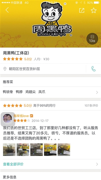 “李鬼”餐厅栖身美团网 假周黑鸭比例超66%