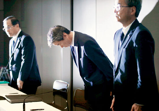 7月21日,东芝总裁田中久雄(中)及其他高层在记者会上深深鞠躬致歉