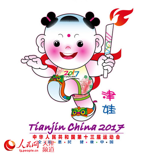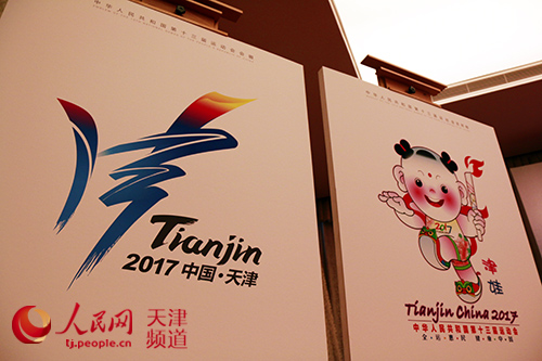 发布会上,第十三届全运会会徽与吉祥物正式亮相。会徽由书法字“津”、“13”、“张开双臂的人形” 和“海河”等元素构成,呈“火炬”造型,取名为“奔向未来”。会徽主色调为蓝色,体现了顽强拼搏、勇攀高峰的体育精神,同时也寓意天津盛世同心、开放包容的内涵。取名为“津娃”的吉祥物,取材于天津杨柳青年画,并与现代卡通形象进行了有机整合,具有浓郁的民族风格和天津特色。“津娃”身着牡丹花图案服装,脚穿虎头鞋,手持全运火炬,做出跳跃的动作,传递出运动的概念,整体形象诙谐、幽默、生动,表现了天津人民作为全运东道主,欢迎来自祖国各地的宾客和运动员,并预祝运动员取得优异成绩的美好心愿。
