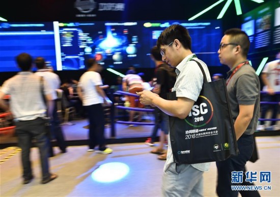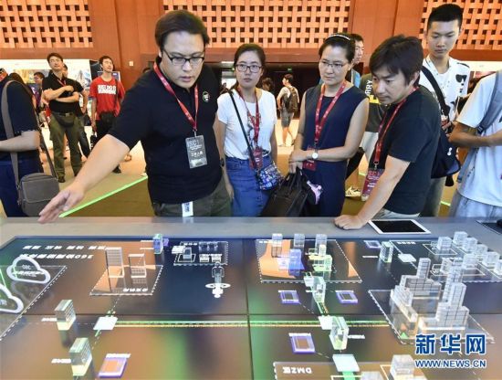 8月16日,参观者走过大会展台。