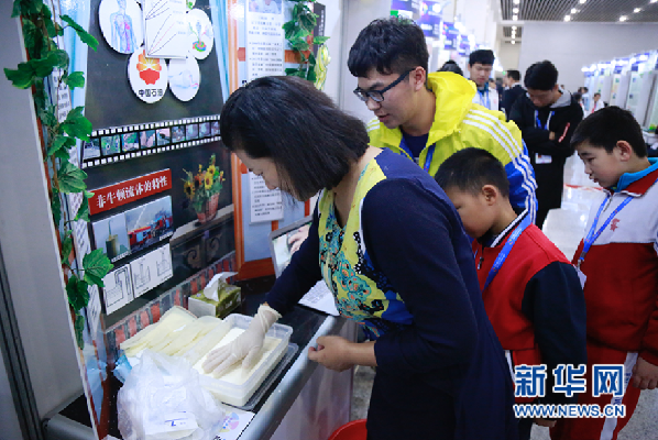 专家评委到参赛展位进行问辨并体验实验过程 (新华网 刘佳摄)