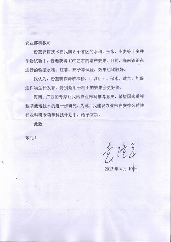 2013年4月10日,袁隆平给农业部写的粉垄技术推荐信。韦本辉提供