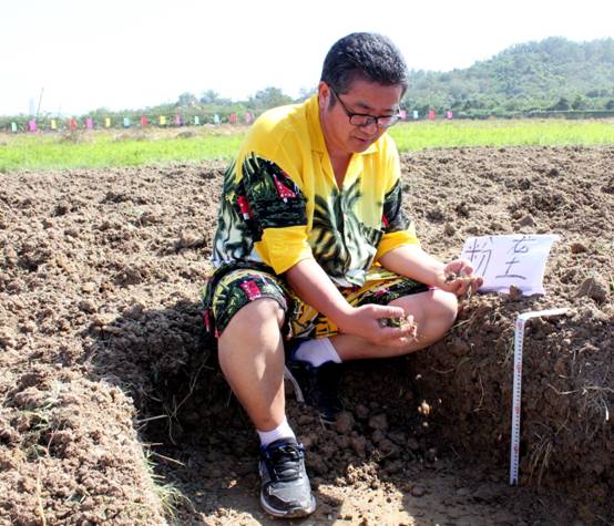 在开工现场,看到粉垄耕作后的土壤松软细匀、深度可达40厘米,袁隆平非常兴奋、连挑大指,称粉垄技术是“革命性的绿色耕作技术”,并高兴地与白德朗、韦本辉、李深文等合影留念。
