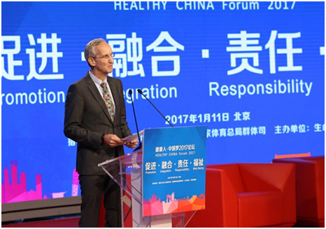 国家卫生计生委宣传司司长毛群安就论坛主题发表致辞说,促进健康,就是要广泛倡导“健康中国”战略,阐述健康中国的理论内涵,走中国特色社会主义健康道路。融合,就是打造一个平台,将政府、社会、媒体、企业集中起来,让卫生和体育融合在一起,大家围绕健康的目标走到一起,发挥各自长处。责任的内涵有二,其一是媒体的责任,健康教育要规范,否则就可能误导老百姓;其二,每个人是自己的健康责任人。只有大家共同努力,才能恭喜健康中国带来的福祉。