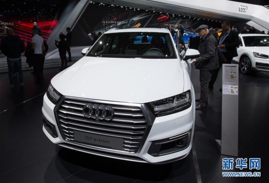 这是3月8日在瑞士日内瓦国际车展上拍摄的奥迪插电混合动力车Q7 e-tron。当日,被誉为汽车领域“风向标”的第87届日内瓦国际车展继续对媒体开放,各厂商展示的新能源汽车备受瞩目。 新华社记者徐金泉摄