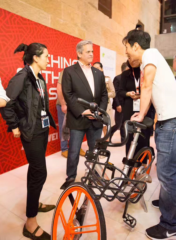摩拜单车创始人胡玮炜在“西南偏南”与奥斯汀市长交流。图片来源:摩拜单车