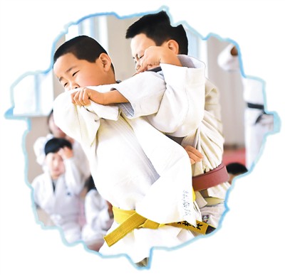 内蒙古呼和浩特的小朋友在进行柔道对抗练习。