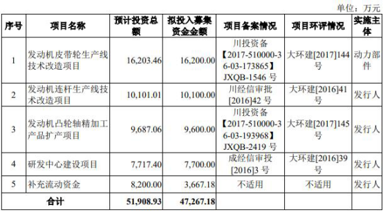 西菱动力上市时披露的公告书显示,公司以每股12.90元的价格发行4000万股,募集资金总额为5.16亿元,扣除发行费用后募集资金净额4.72亿元。其中,1.62亿元用于发动机皮带轮生产线技术改造项目;1.01亿元用于发动机连杆生产线技术改造项目;9600万元用于发动机凸轮轴精加工产品扩产项目;7700万元用于研发中心建设项目;3667.18万元用于补充流动资金。