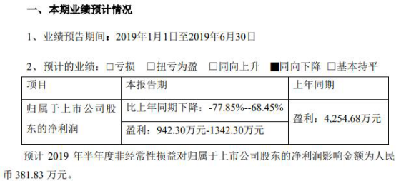 2019年7月11日,西菱动力披露了2019年半年度业绩预告。2019年1月1日至2019年6月30日,西菱动力预计归属于上市公司股东的净利润为942.30万元-1342.30万元,比上年同期下降77.85%-68.45%。