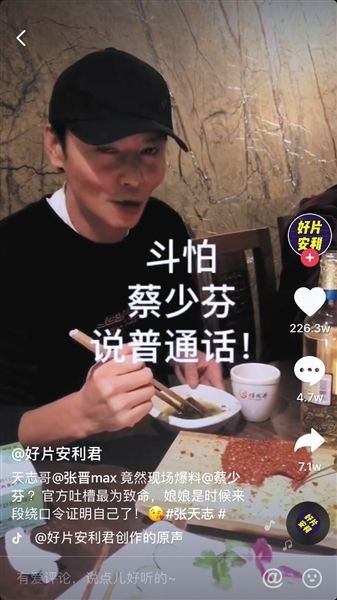 《叶问外传:张天志》的主演张晋是重庆人,妻子蔡少芬是中国香港人。在电影抖音号发布的一则视频中,张晋在吃火锅的时候说出了“天不怕,地不怕,就怕蔡少芬说普通话”这句传播很广的话。这段视频是在抖音首发,获得了226万个赞,很快就上了抖音热搜,一些营销号将这段视频搬运到微博、今日头条等其他平台,也全部都上了热搜。