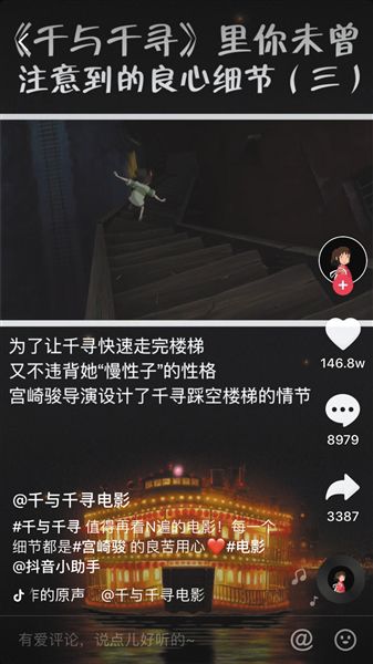 宫崎骏的动画电影《千与千寻》今年6月份内地上映,其实这部片子很多观众之前都看过了,对于片子的内容都很熟悉。不过营销团队另辟蹊径,挖掘了一些电影中观众未曾注意到的细节做成短视频,依然有不少流量。比如,对比中年人和10岁女孩走在石板路上的不同音效,有63.8万个赞。为了让千寻快速走完楼梯,又不违背她“慢性子”的性格,宫崎骏导演设计了千寻踩空楼梯的细节,收获最高赞数146.8万。