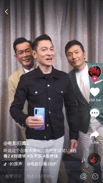 张家辉与任贤齐演“双簧”;雷佳音、李光洁、郭京飞三人发起“土味情话”挑战;刘德华用手机召唤出古天乐与苗侨伟……这都是电影营销公司在短视频平台上使用的营销术。记者采访这些短视频中的演员时,张家辉和苗侨伟都坦言完全不知道自己在干什么,但就是这样“懵懵懂懂”拍出的小视频,却在抖音等短视频平台获得了极高的点赞数和观看量。