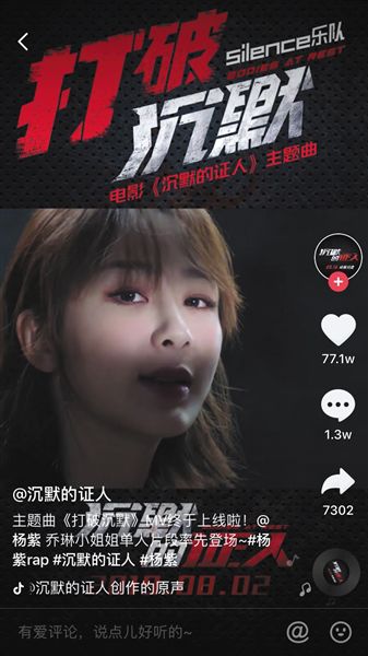 去年主演了电视剧《香蜜沉沉烬如霜》,最近又有一部热剧《亲爱的,热爱的》刚刚收官,再加上刚刚上映的《烈火英雄》,这段时间,杨紫的热度达到了峰值,自身携带巨大流量。因为《沉默的证人》有欧阳靖客串,他曾参加过《中国有嘻哈》的选秀节目。去年宣传电影的时候,营销团队让欧阳靖与杨紫做了一个互动,两人唱了一段rap。拍这段视频是在去年冬天,视频中杨紫还穿着羽绒服。视频最近才在抖音发布,正好赶上杨紫热度最高的时候,在抖音上获得了89.7万的点赞。而杨紫单人演唱主题曲的MV也收获了76.7万点赞。