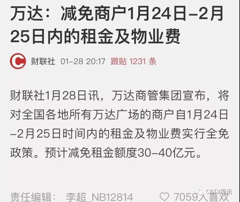万达集团以房东身份率先提出,减免一个月商户租金。按上年度万达租金营收384亿元计算,王健林的一个号令,全国万达商铺减免的租金也达到了30亿元。