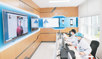 江苏省南通市首家互联网医院、南通市第六人民医院主任医师茅力平(右一)为患者进行视频问诊、看片。