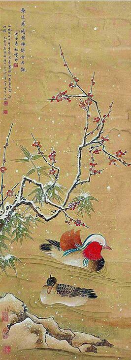 这幅笔法兼工带写的《雪里鸳鸯》,创作于1948年。背景穿插着几枝疏朗的红梅,树上的积雪和漫天飘舞的雪花充满着寒意,树下一对羽色鲜艳华丽的鸳鸯悠然结伴游于岸边。整个画面安详静谧、意境幽远,神接宋人,无一丝烟火之气,深刻地表达出“浓香残月玲珑影”的动人诗意,于萧肃中透出淡淡的春之信息。款识为“春近寒虽转,梅舒雪尚飘。戊子春初,雪翁。此帧系戊子年旧作,写春寒虽劲,春意已露之意。”细品此画,景物虽不繁杂,但主次分明、动静相应、虚实相生,于平淡中彰显出独特的韵味。