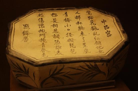 白地黑花诗文八角形枕