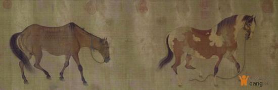 代表作《二马图》(图1),绢本设色,纵28.8厘米,横142.7厘米,承袭并发扬了唐人画马的高超技艺传统,以写实手法,通过肥瘦两马之对 比,以马拟人,以物喻世,针砭时弊,抨击官场腐败。画面上,前马膘肥肉厚,昂首,碎步轻盈,尾巴飘逸,志得意满;后马骨瘦嶙峋,肋骨清晰,低头,步履蹒 跚,尾巴蜷缩,疲惫困顿。画中细节处理更是耐人寻味——肥马马首挽着笼头,但缰绳松开,拖逸于地;瘦马非但有笼头,缰绳还套在马脖之上。任仁发藉此阐述了 自己对于当时吏治的看法:一匹没有约束的脱缰之马,一旦失去控制,难保无法无天,为肥己而鱼肉百姓;一匹有约束的拴着缰绳的马,因有管制所以尽心尽力,克 勤克俭。由此无情鞭挞其时官场及社会的种种腐败现象,用心可谓良苦。《二马图》超凡脱俗,曾入选2002年上海博物馆举办的晋唐宋元72件书画国宝展,令 人驻足沉思。