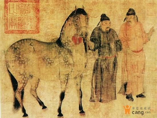 《神骏图》(图2)堪称任仁发刻画宫廷圉官和良马的经典之作。画中骏马壮实丰肥,英姿勃发,富贵悠然,气度高雅,特别是马身花纹勾线圆浑,富有 变化,赋色清雅,晕染细腻;唐人装束的人物,形象饱满,相互顾盼,意态自然,尤其是衣纹线条流畅,敷色明丽,深浅参见,互衬互补。整幅画面造型逼真,用笔 劲健,神气生动,显示出画家精细过人的状物技巧,更代表了元代人物画高超的艺术水平。《神骏图》上钤有“乾隆御览之宝”、“嘉庆御览之宝”、“石渠宝笈” 等藏印,亦可窥知其精彩绝伦。