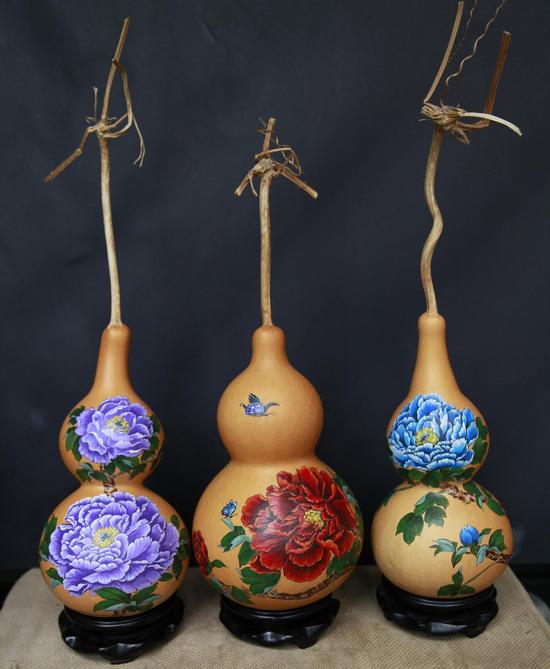 工笔画葫芦:主要采用中国传统工笔画技艺和题材进行构思创作。图案主要有牡丹、花鸟、山水等素材,运用传统书画技巧,结合油画、国画等元素,创作出工笔画葫芦精品。