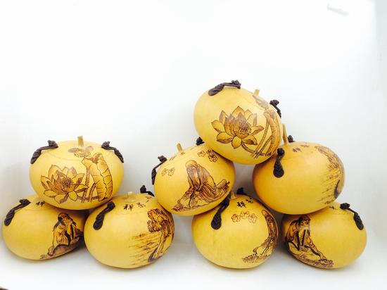 烙画葫芦:图为葫芦工坊猴年的新作品“四勿猴”,以烙画创作。烙画葫芦艺术又称烫画,火笔画,艺术家用烙铁在物体上熨出烙痕作画,与葫芦融为一体能永久保存、收藏,艺术价值极高。