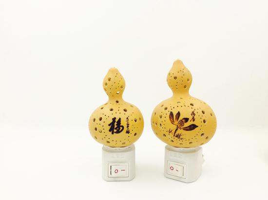 葫芦小夜灯:通过打孔、镶嵌等工艺精心制作。图中的“福”为康熙御笔的天下第一福,通过烙画的形式烙到葫芦上。右边那款为恭王府定制。